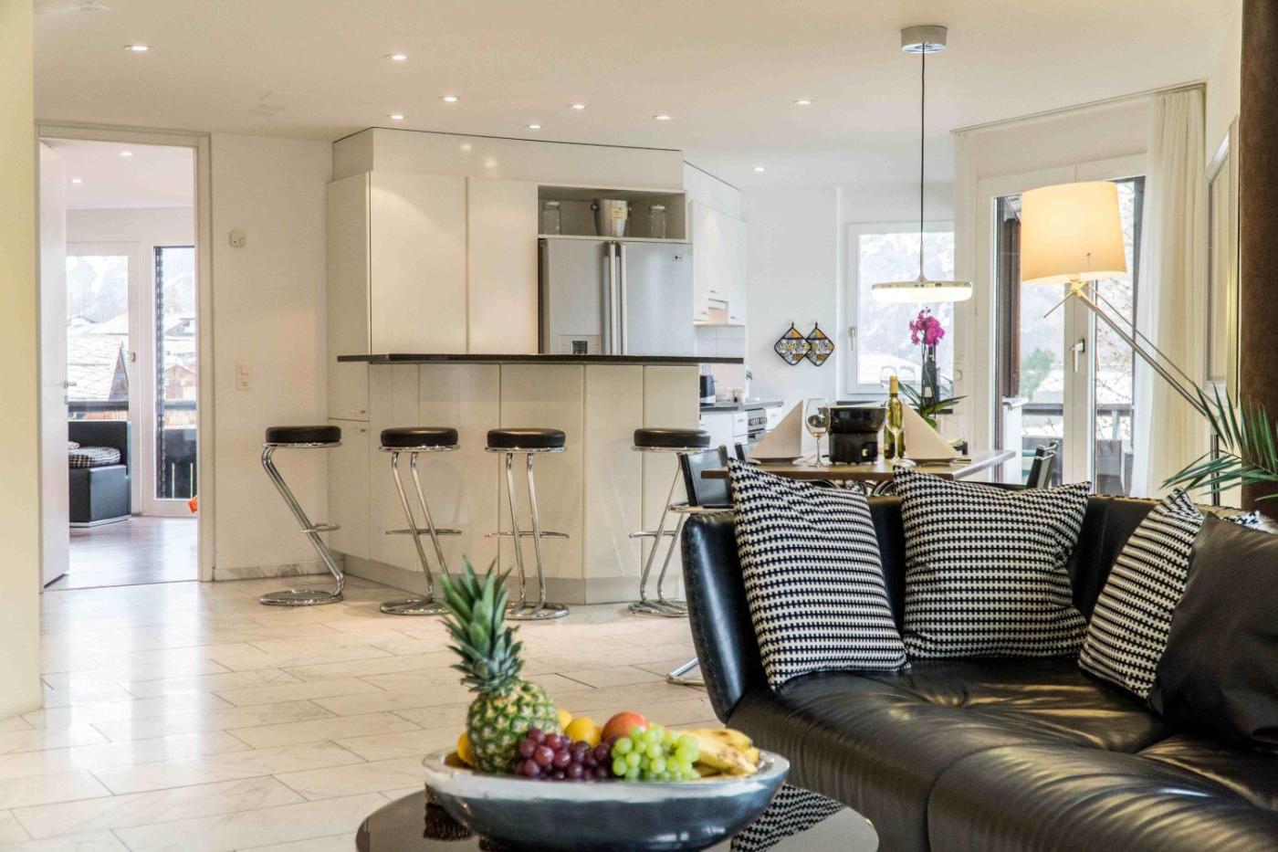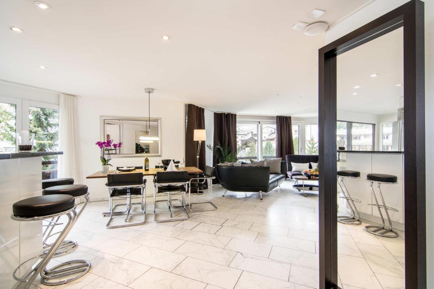 Superior Apartment (2-4 adults). Spacious luxurious apartmemt comprises a bedroom, living room with a dining area and a modern fully equipped kitchen. It features a fireplace, floor-to-ceiling windows and a furnished balcony with panoramic views overlooking the Alps.